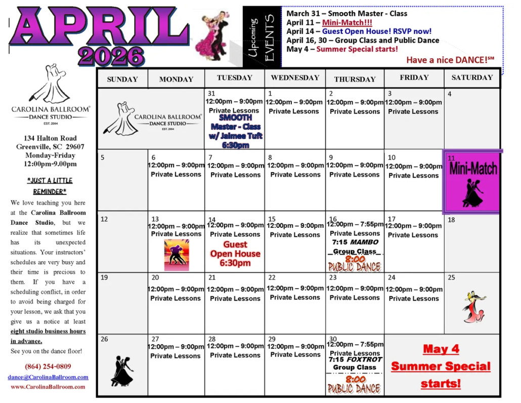 Class ScheduleApril 2026 Dance Classes Calendar
